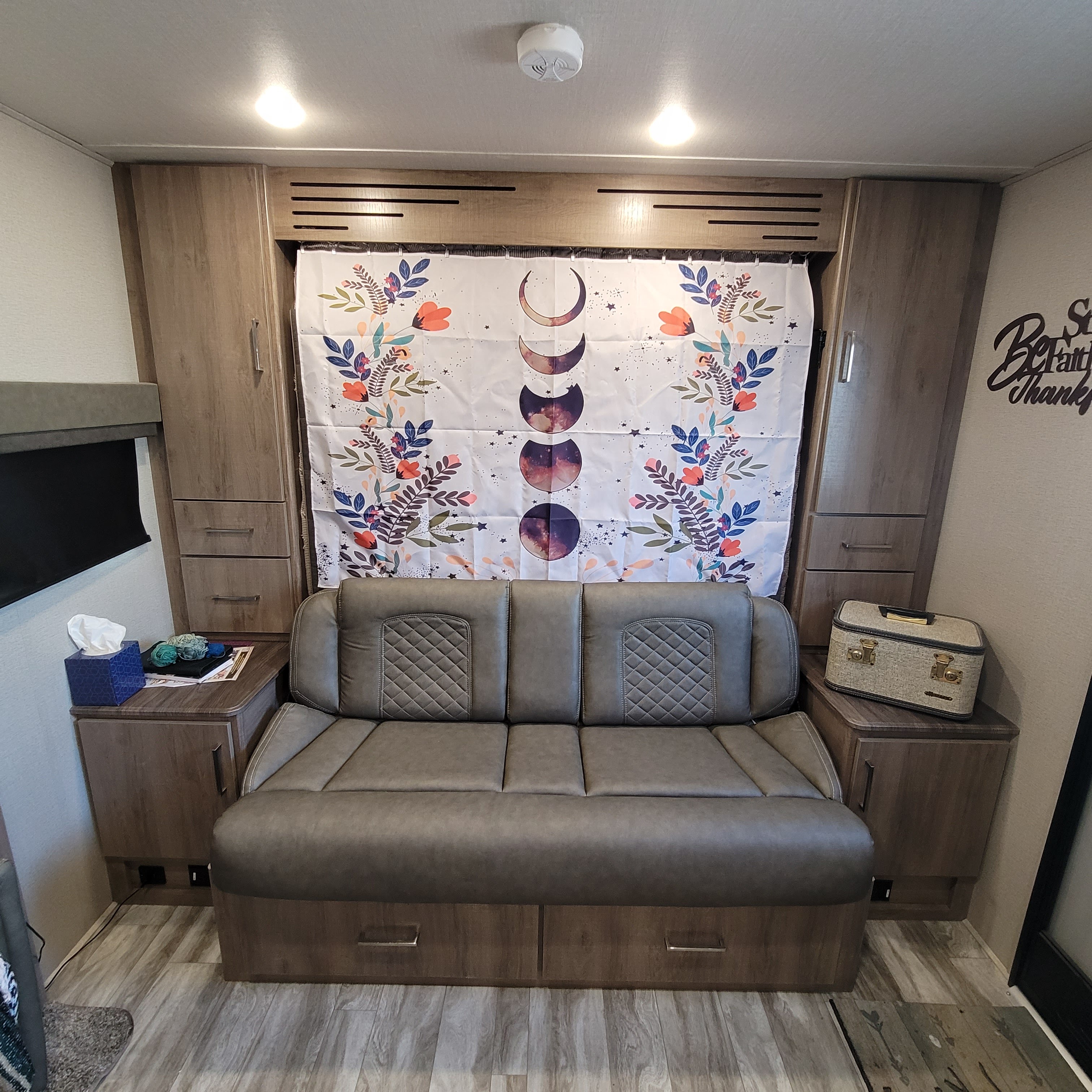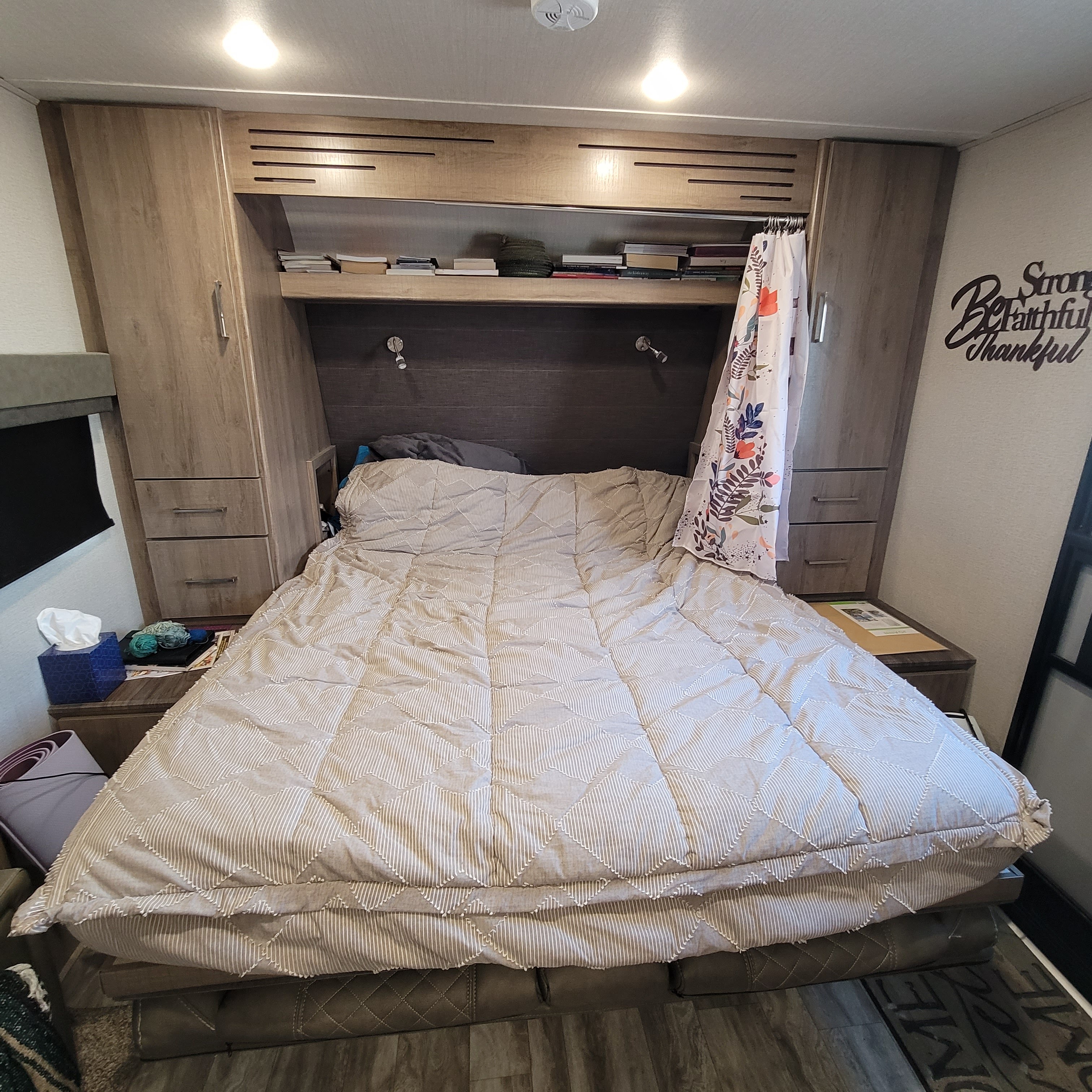 I always though Murphy beds were so cool and now I have one. It takes no time to set up plus there is room to store stuff when I am traveling. You can’t see in the picture but there are cubbies on both sides of the bed to use as a nightstand. It has a couple plug ins to charge my phone and watch. There is also enough room to hold whatever people put on a nightstand – water, a book etc. I have learned to open it up about an hour before I climb into it. The heat doesn’t get into that section with the bed closed. It is COLD between the sheets!