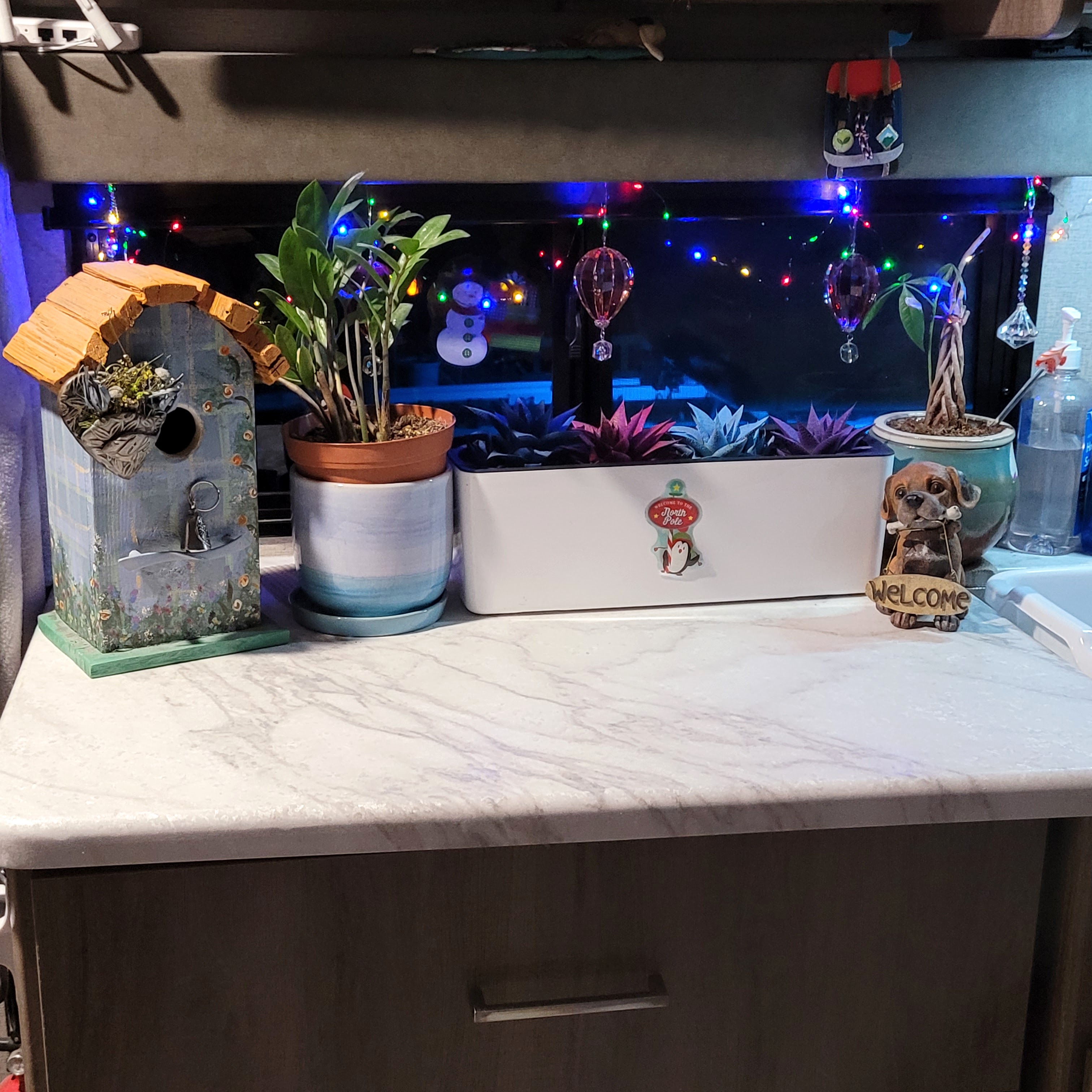 Today has been a lazy day. I put up some led lights in the kitchen, organized a few drawers. There are three open cubbies in the bathroom. It has another one on the bottom but it is closed off. We removed the cover and found some more storage. Always a good thing.