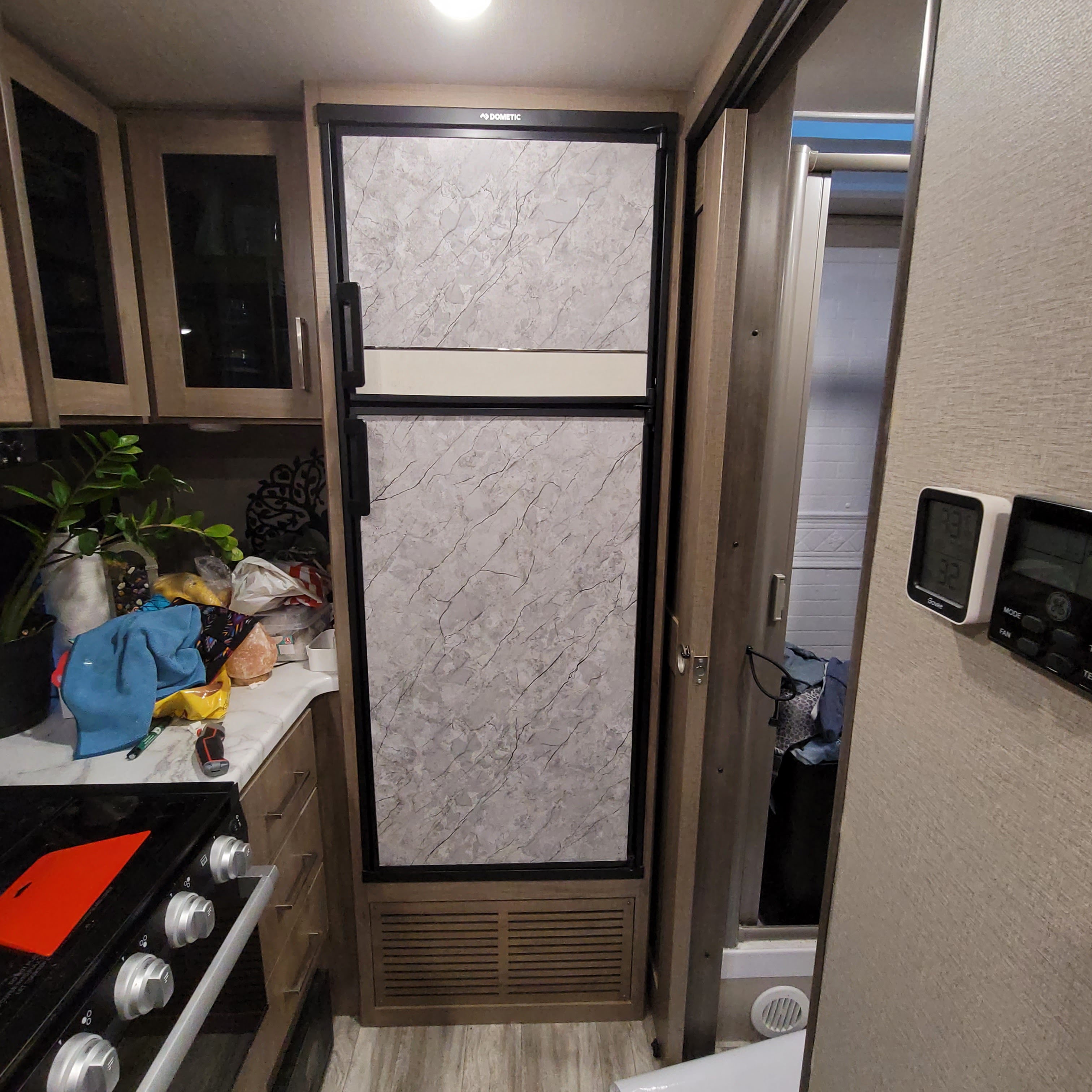 I have been doing some decorating here. I have never owned my own home so this is a new experience for me. I added some peel and stick contact paper to the refrigerator. It is for countertops so hopefully it will last awhile. If I get tired of it, I can change it. It isn’t as dark in the back corner with the marble front.