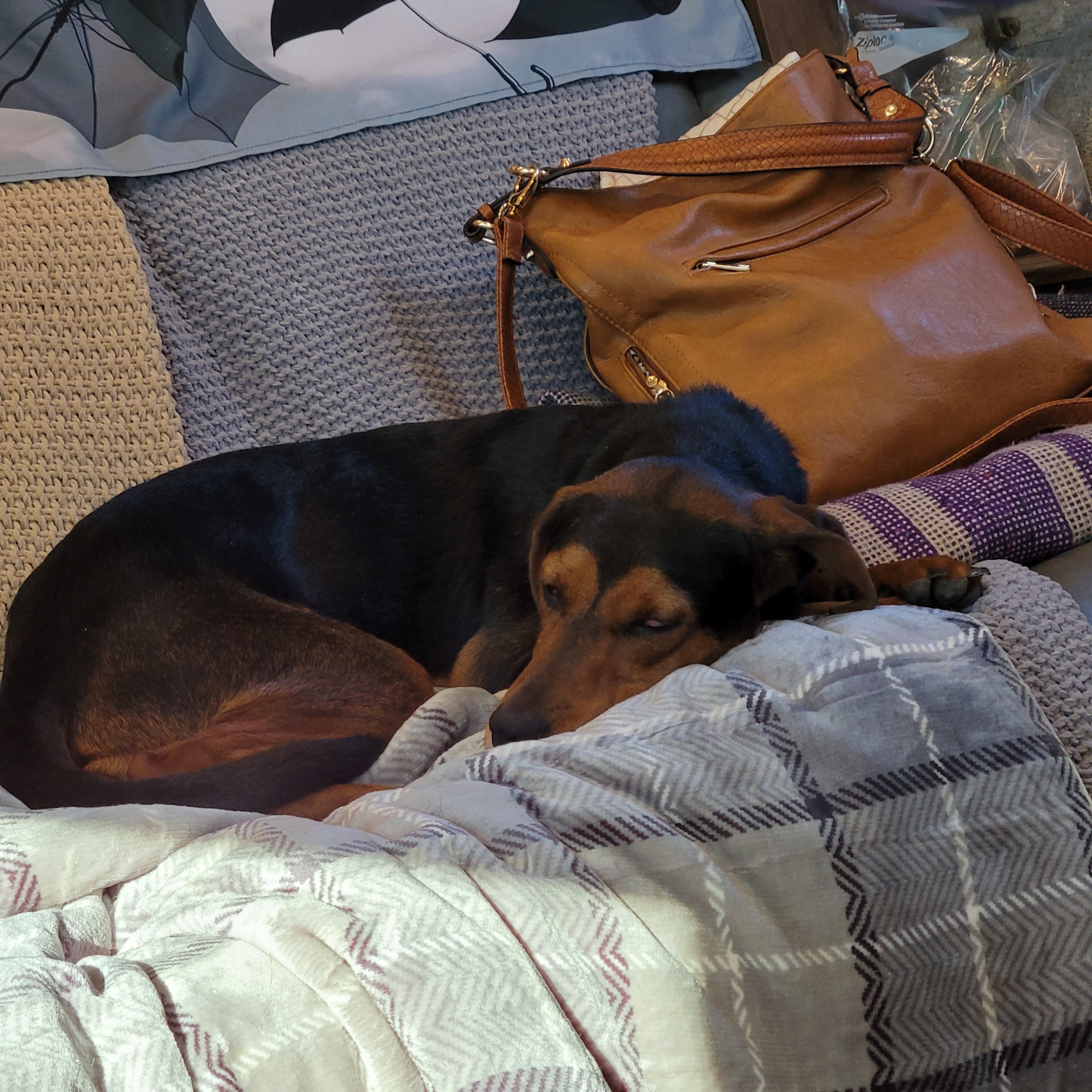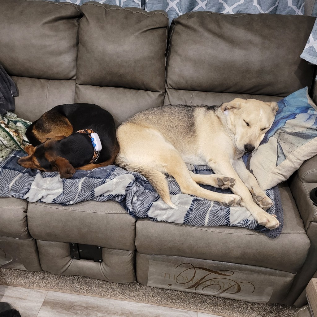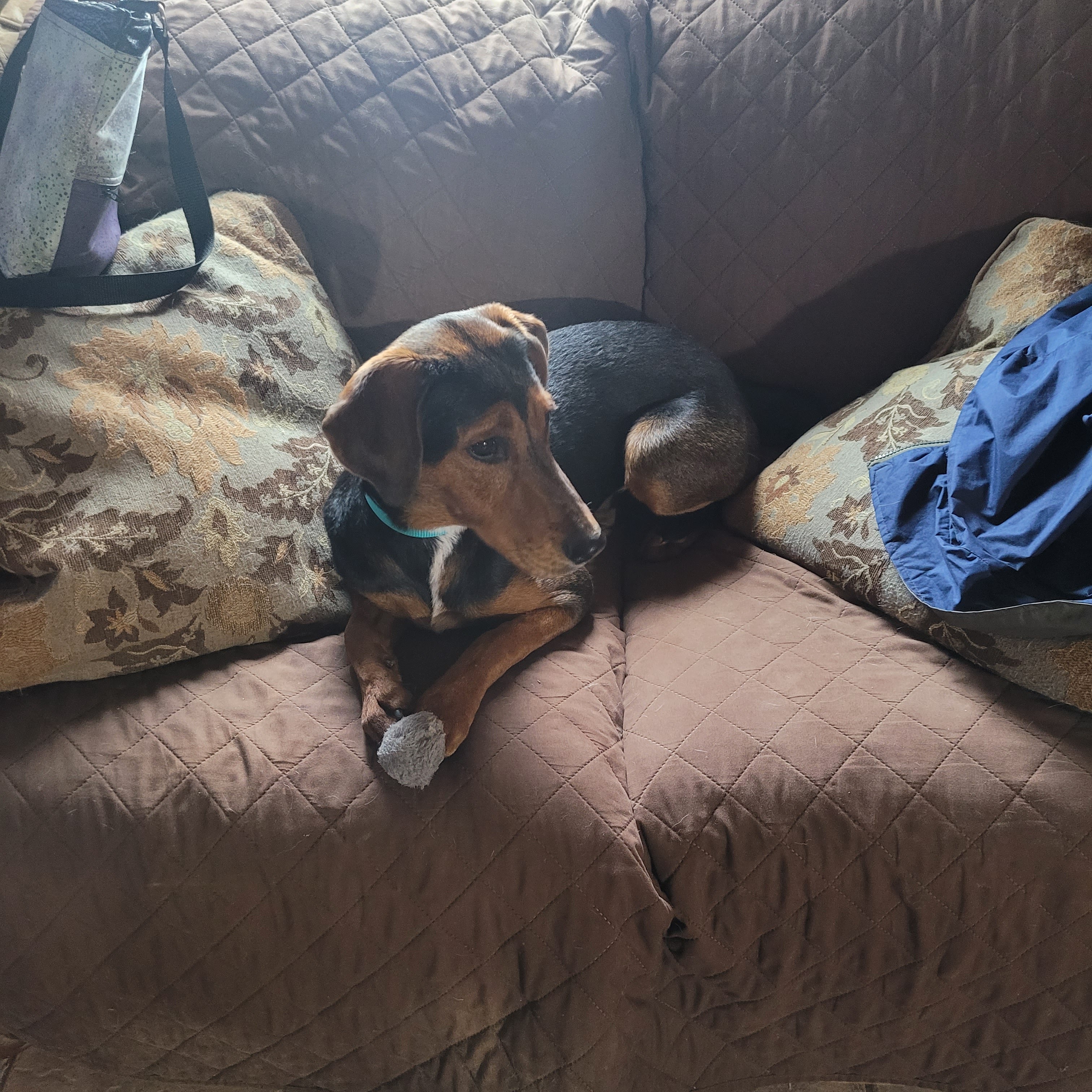 Soon after coming home, still scaredEars are more perkyShe and Astrid playing in my Mom’s yardShe has her spot on the couchAstrid