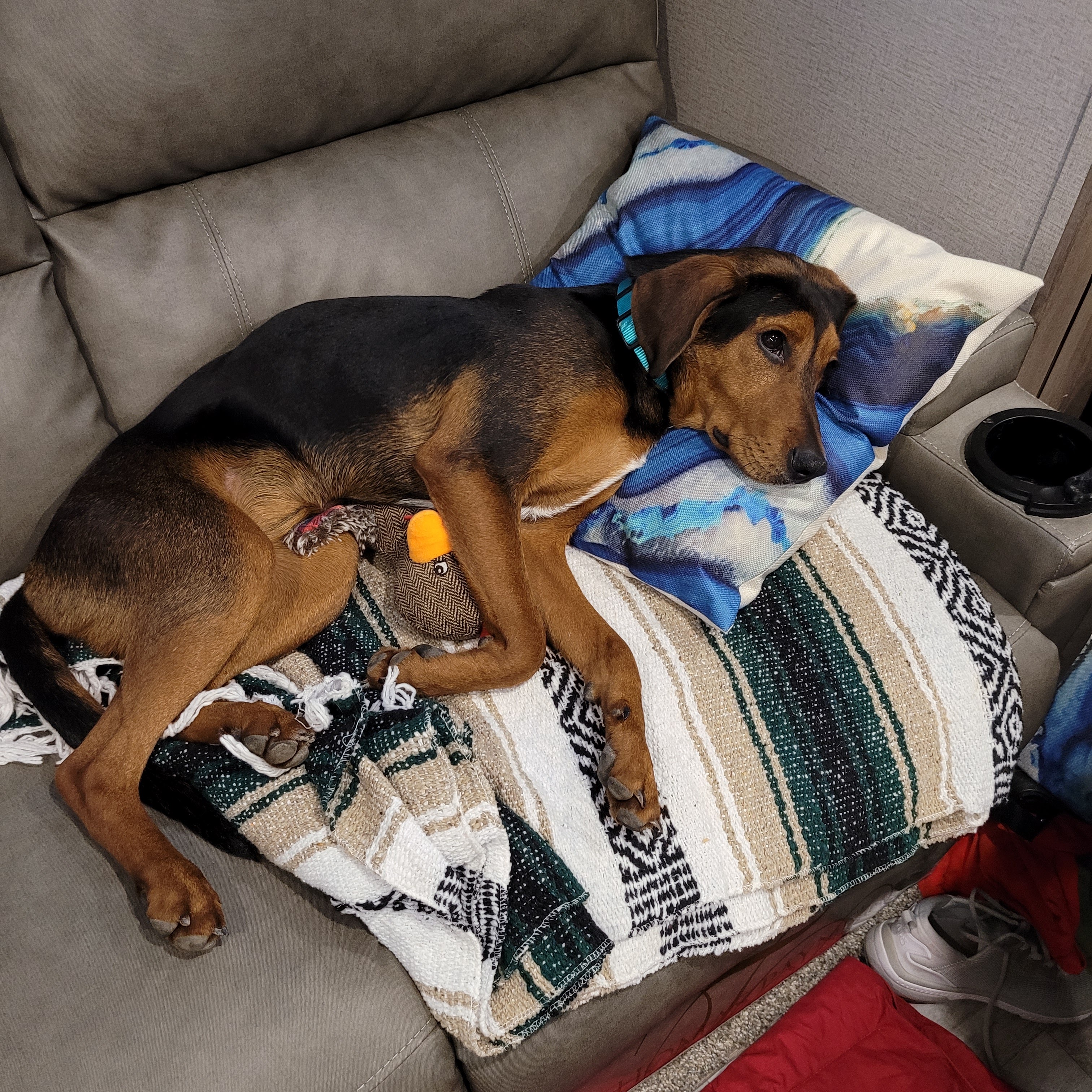We are slowly finding our way. She doesn’t like to lead. She will not walk out of the trailer ahead of me, even on a leash. She is really nervous when eating. She acts like someone is going to take her food. But she trusts me. Those dark, deep eyes do not miss a thing. She never stops moving unless she is sitting next to me or sleeping. She was called Rosie in the shelter but already knows her name is Gypsy. She is starting to learn how to play. She and Astrid decided to play keep away with a tennis ball at 2 o’clock this morning!