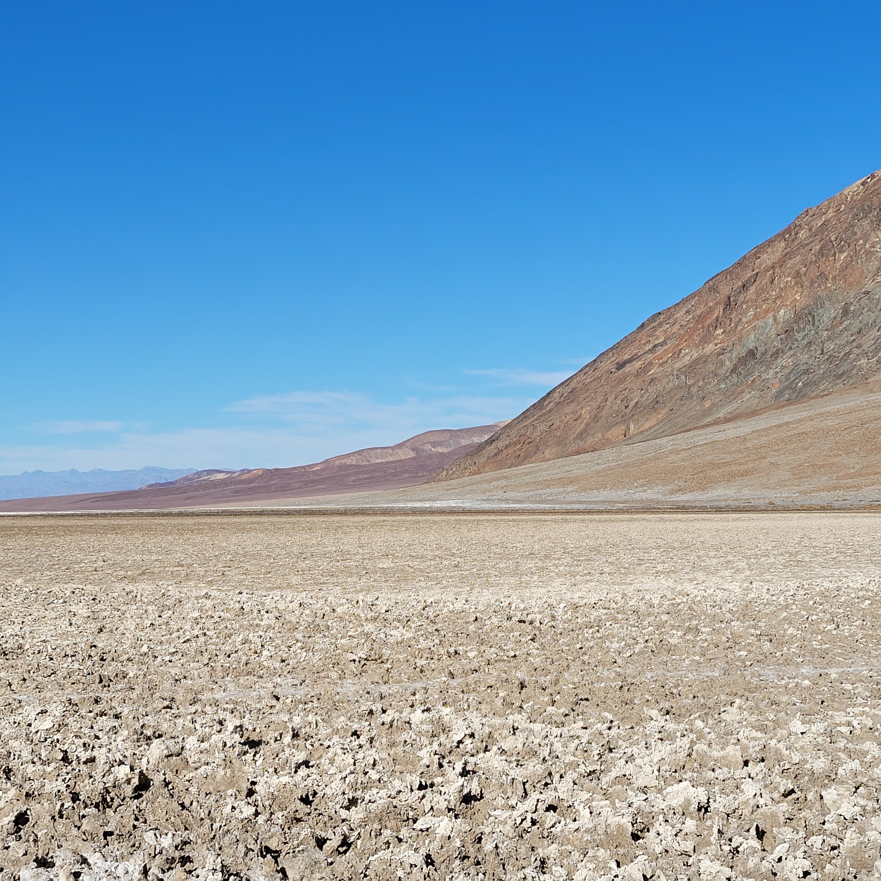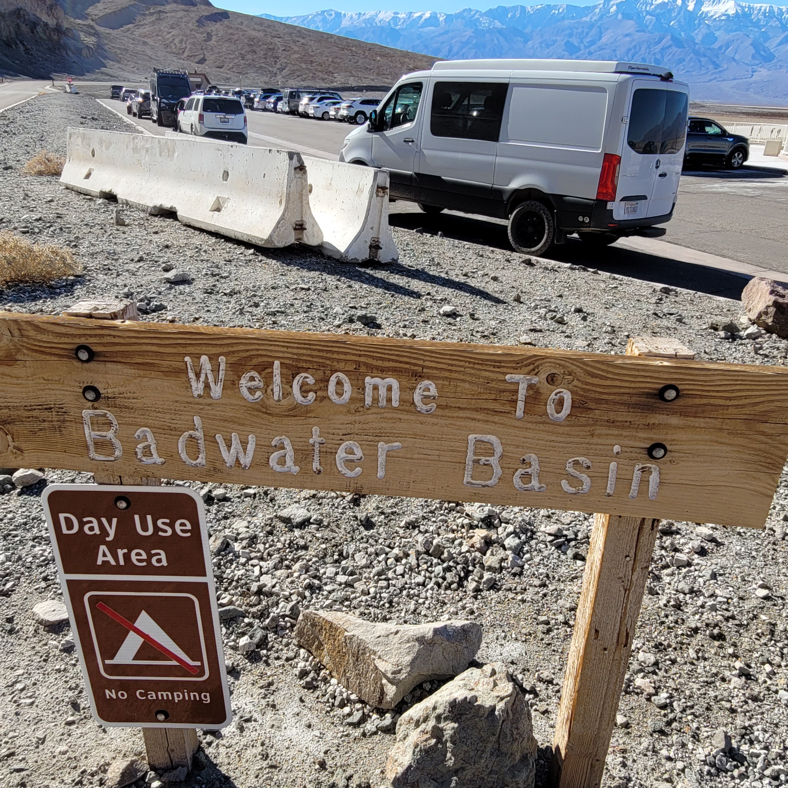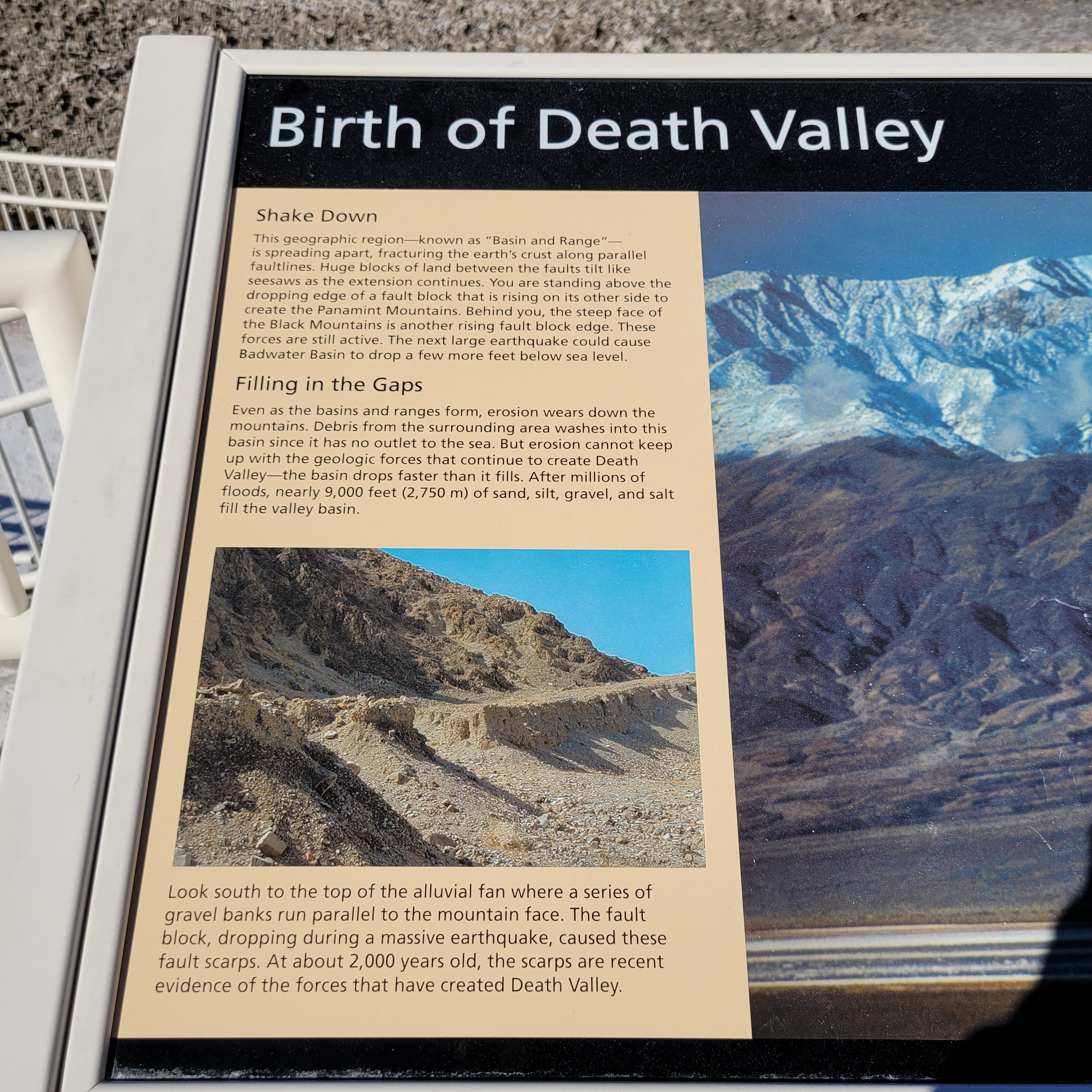 Then we headed down to Badwater Basin. It is at the bottom of the Dante’s Point pictures. The elevation there is 282 feet below sea level. This is the lowest point in North America. It is covered with salt.